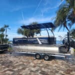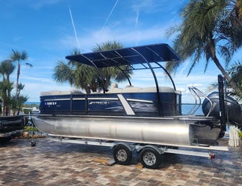 Custom Bimini Top: We manufactured a custom Bimini top for this pontoon boat. Using our radius arms electrostatic, we painted it with a 25-year finish. At the top, there is a custom-made trampoline manufactured with top-of-the-line canvas. All aluminum construction, Healy arc-welded, bolted through the base. This really gives a great sleek look to this tritoon pontoon boat.